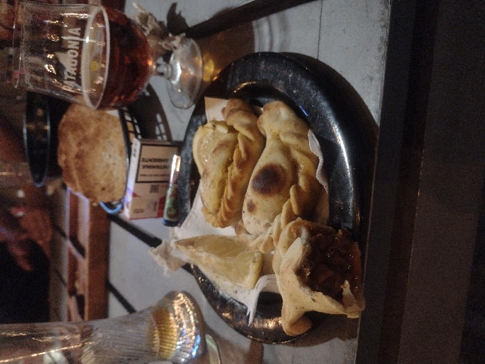 - "A plate of empanadas rests on a black metal surface alongside a partially visible beer glass displaying "Patagonia" lettering and a smaller glass" by FM-p5xTo2, licensed under CC BY 4.0