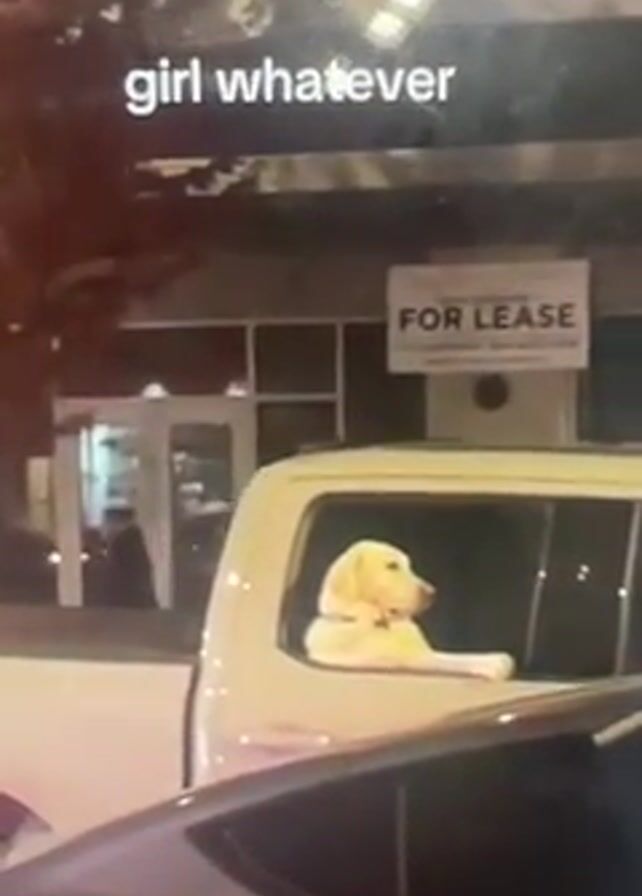 still image of a cream-colored Labrador retriever sitting in the back seat of a white pickup truck. The dog is positioned with its front paws resting on the door, gazing out of the window. Above the image, the words “girl whatever” are superimposed. The scene is set at night, with a building displaying a “FOR LEASE” sign visible in the background. Other cars are visible in the foreground, and there is ambient city lighting. The video appears to be a digitally zoomed-in and cropped version of the original image.