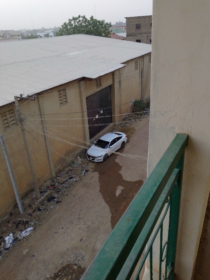 An elevated perspective captures a white sedan parked adjacent to a large warehouse with a corrugated metal roof and a substantial sliding door. Power lines traverse the scene, connecting to a utility pole. Debris litters the ground near the warehouse wall. A green balcony railing frames the foreground, offering a partial view of a nearby building. Other structures and trees are visible in the distance under a hazy sky.