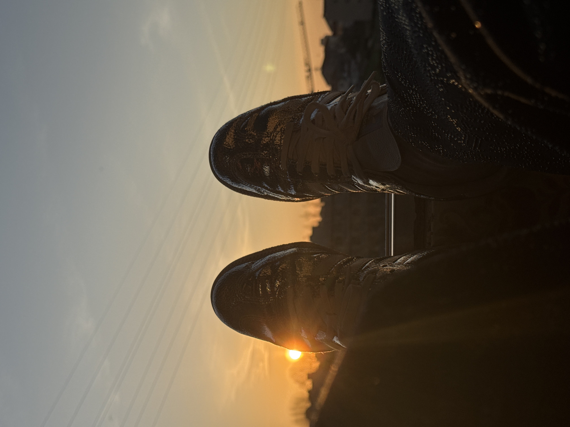 - "The image captures a low-angle view of a person's feet, clad in dark, textured shoes with light laces, positioned horizontally against a sunset or sunrise over Vila Nova de Gaia, Portugal" by FM-euyLP2, licensed under CC BY 4.0