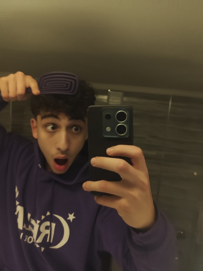 - "A young man in a purple hoodie takes a selfie in front of a bathroom mirror" by FM-BskwX2, licensed under CC BY 4.0