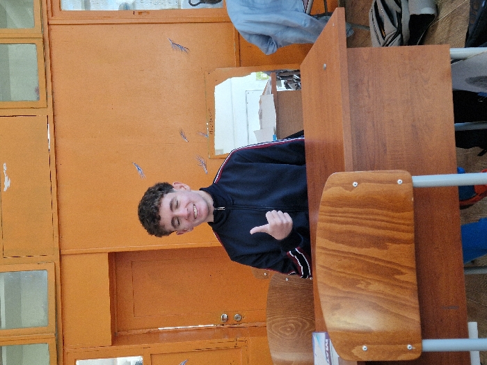 The image depicts an interior scene, likely a classroom or office, located in the city of Troyan, Bulgaria. A young male individual, with short, dark, curly hair, is centrally positioned, seated behind a light brown wooden desk, facing the viewer. He is wearing a dark blue zip-up track jacket with red and white stripes on the sleeves. His mouth is upturned in a smile, and his right hand is raised, forming a thumbs-up gesture. To the right of the main subject, a second individual is partially visible, seated behind another desk, with a light blue garment draped over their chair. The background wall is painted a uniform orange and is adorned with several small, stylized blue feather decals. A light orange wooden door with a dark handle is visible on the left side of the frame. Above the door and extending across the top of the wall are rectangular panels, some appearing to be windows or translucent dividers with white frames. A window is also visible on the right side of the frame. Below this window, a white board or picture frame leans against the orange wall. In the immediate foreground, the wooden backrest of a chair with a light gray metal frame is present, partially obscuring another wooden desk where a light-colored object rests on the left. A dark-colored backpack is situated on the floor to the right of the main subject's desk.