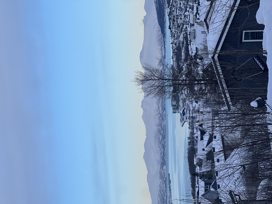 The image displays a panoramic winter landscape of Tromsø, Norway, viewed from an elevated position. The sky occupies the upper two-thirds of the frame, presenting a clear, pale blue gradient, lighter towards the horizon. In the immediate foreground, snow covers the ground and the roof of a dark-colored wooden building, partially visible on the right, which features a single white-framed window. A black snow shovel is leaning against a bare tree near this building. Numerous bare deciduous trees and shrubs, some partially obscured by snow, are scattered throughout the foreground and midground. The midground reveals a significant portion of Tromsø city, characterized by a dense arrangement of residential houses, all with snow-covered dark roofs, built on varied terrain. Beyond the urban sprawl, a wide, calm body of water, likely a fjord or strait, reflects the pale blue sky. On the opposite side of the water, further urban infrastructure is visible, including what appear to be multi-story buildings and dock facilities. Several small vessels are present on the water. The background is defined by a continuous range of snow-capped mountains, extending across the entire horizon, appearing white and blue under the clear sky. No individuals, actions, or specific interactions are visible within the scene.
