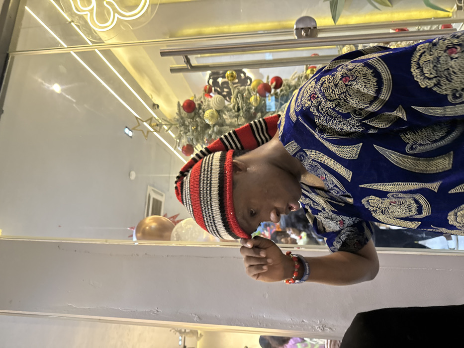 A person wearing a striped red and white hat, as well as a blue and gold patterned shirt, stands near a glass wall with a Christmas tree reflection. The individual is looking down, with a hand raised towards their face. The person's wrist is adorned with beaded bracelets. Balloons and a window are visible in the background through the glass.