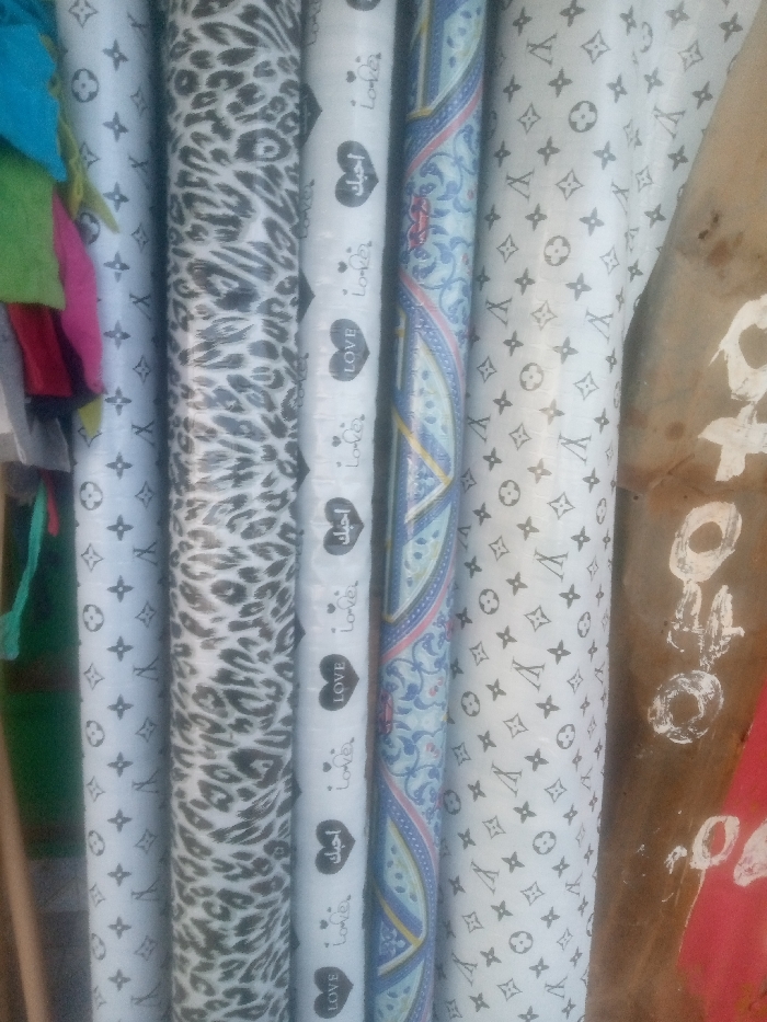 The image displays a collection of fabric rolls with varying patterns. One roll has a repeating "LV" logo. Another features a black and white animal print, resembling leopard spots. The third roll is white with "Love" and "Uhibbuk" written in Arabic, along with heart symbols. Finally, a roll showcases a blue and pink geometric design. The image also captures a glimpse of colorful fabric swatches on the left and a painted surface on the right.