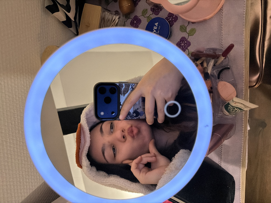 A young woman in a hooded, furry-lined sweatshirt is seen in a circular, blue-lit mirror selfie. She's pouting her lips slightly. Her phone case has a whimsical design. The background is a vanity table with various items, including a Nivea cream container, makeup brushes in a clear holder, and other cosmetic items. The scene is brightly illuminated by the ring light's glow.