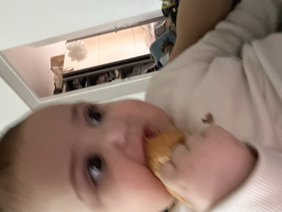 A close-up image shows a baby with light skin, dark eyes, and full cheeks, wearing a white long-sleeved top featuring a small brown emblem on the left chest. The baby holds a light brown, elongated piece of food in its right hand and has it partially inserted into its mouth, actively consuming it. The baby's eyes are directed towards the right side of the frame. The blurred background reveals an indoor domestic setting. To the right, through an open doorway, a dark, multi-shelved unit (likely a closet or bookcase) is visible, along with a partial view of a bed with patterned covers and a white spherical decoration or light fixture. A darker surface, resembling an adult's arm or leg, is present in the lower right, alongside a light blue object with an indiscernible design. The scene is located in Strasbourg, France.
