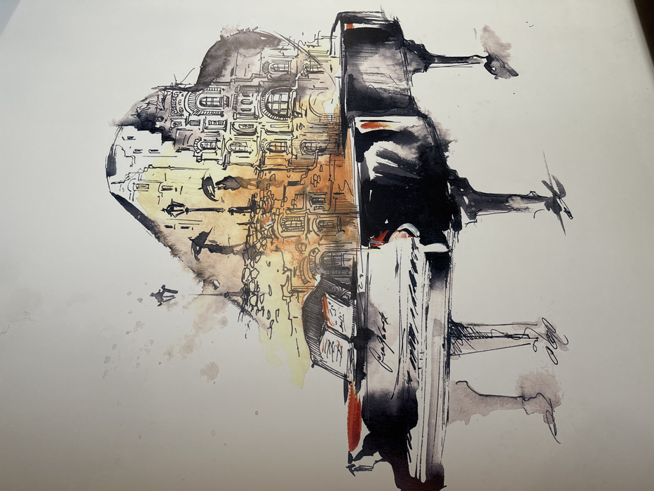 This watercolor and ink artwork depicts a black grand piano from which an urban cityscape dynamically emerges