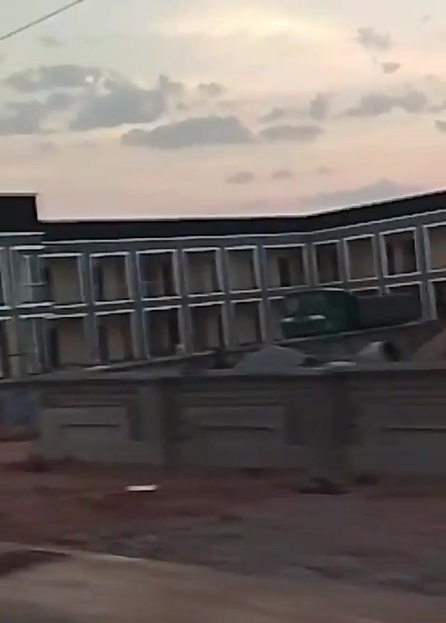 The video appears to be shot from a moving vehicle. The camera quickly passes a mosque-like structure, then a person walking on the side of the road. The camera moves past a billboard featuring a man in a white outfit and a green logo, the name "LAFIA OBI" is visible on the billboard. Further down the road, there is a gathering of people next to a building. Palm trees and electrical poles are visible in the background. The road is red dirt, and there are piles of construction material on the sides. The sky is overcast.