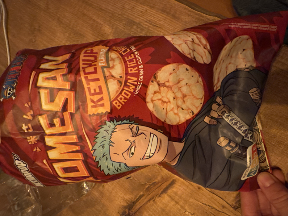 - "The scene depicts a reddish-brown, flexible plastic bag of "OMESAN" brand "KETCHUP FLAVOR BROWN RICE CHIPS" held by a human left hand" by FM-xTDQG2, licensed under CC BY 4.0