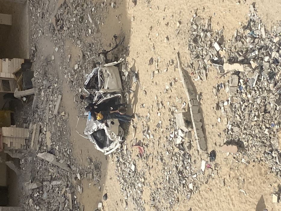 The image depicts a scene of extensive destruction in Khan Yunis, Palestinian Territory. The ground is predominantly covered in sand and large quantities of concrete rubble, fragmented building materials, and debris. In the center, a white sedan is severely damaged, with its roof partially collapsed, doors crumpled, and interior exposed. Three individuals, appearing as adult males or older youths, are present around the vehicle. One individual, wearing a black shirt over a yellow hooded sweatshirt, stands by the open driver's side door, holding a circular metal object, possibly a pot or basin. Another individual in a black shirt leans into the front passenger side of the car. A third person is partially visible further into the passenger compartment. In the background, remnants of heavily damaged or demolished structures are visible amidst more rubble. The foreground shows additional scattered debris and a partial concrete barrier structure.