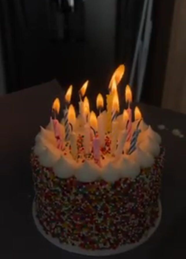 A birthday cake topped with numerous lit candles sits on a table. The cake is covered in colorful sprinkles and has white frosting around the top edge. The candles are various colors including pink, white, and blue. The background is dark, suggesting the room is dimly lit, with the reflection of a kitchen appliance visible.
