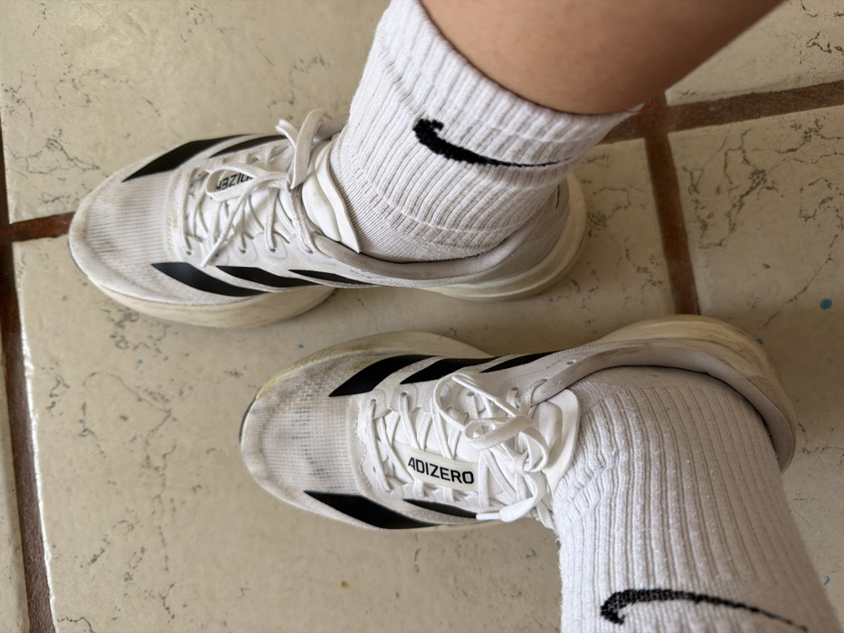 A pair of white Adidas Adizero running shoes are on a tiled surface