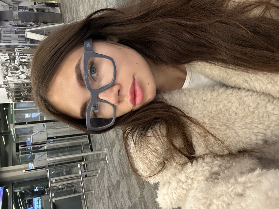 A woman with long brown hair and blue eyes, wearing gray-framed Gucci glasses, poses for a selfie. She's wrapped in a fluffy, cream-colored coat. The background features an airport terminal with security barriers, signs, and a grayscale image of a city landscape. The floor is a gray tile pattern. The picture is slightly rotated.