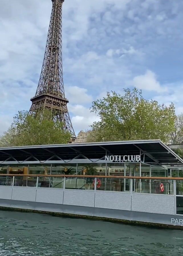 view of the Eiffel Tower in Paris from the Seine river. The camera pans from the tower, across a floating structure with the words "NOTTI CLUB" and "PARIS SEINE" on it, to a row of docked boats along the riverbank. The camera then pans further down the river, showing more buildings in the distance and a boat traveling under a bridge. The sky is cloudy with patches of blue.
