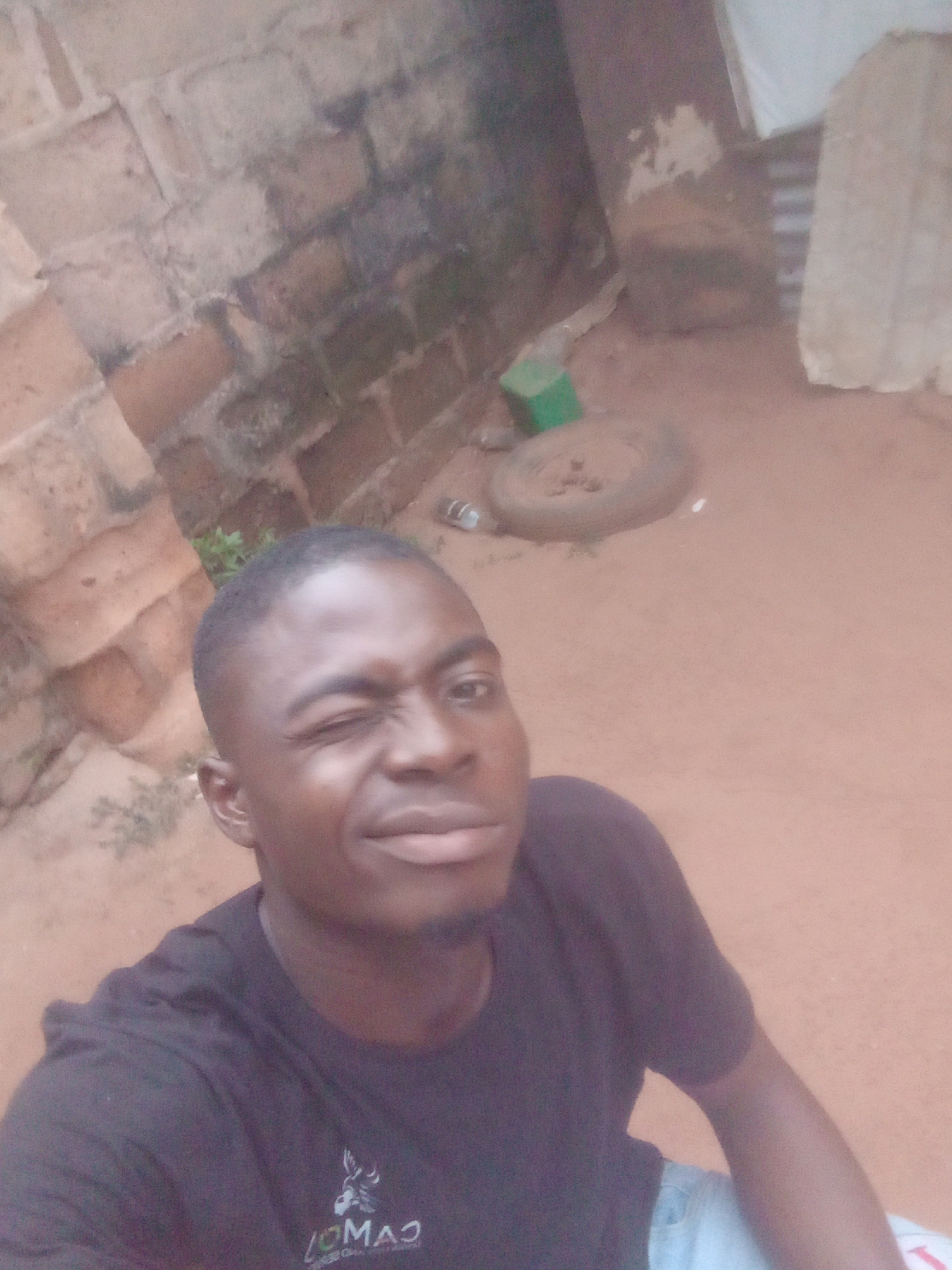 A young adult male, likely of African ethnicity, is depicted in a medium-close-up selfie, winking with his right eye and exhibiting a slight smile. He has short hair and wears a dark, short-sleeved t-shirt with a partially visible light-colored graphic on the chest. Light-colored lower garments are visible at the bottom right. The background consists of a weathered reddish-brown brick wall to the upper left and a reddish-brown earth ground. Objects present on the ground include a dark green rectangular item, a dark circular object resembling a tire, and a plastic bottle. Sparse green vegetation is visible. Corrugated metal sheeting and light-colored fabric or plastic are discernible further in the background. The scene is located in Ogidi, Nigeria.
