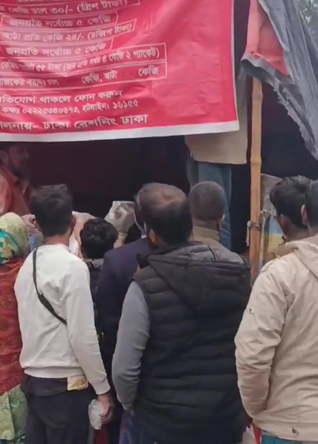 line of people waiting to receive items from a small booth or stall. A red banner is hung over the booth with text written in Bengali. A man inside the booth, wearing a light pink shirt, is seen interacting with people in the line. The people in the line consist of men and women. One woman is wearing a green and red sari with a printed design. Several men are wearing winter jackets or sweaters. The environment appears to be outdoors, possibly in an urban area. Near the end of the video, an older man with a red beard is seen holding a small, old hand blower, seemingly detached from the scene.