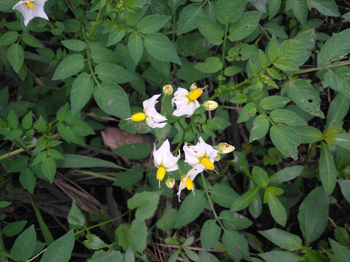 - "A close-up, top-down view depicts a flowering plant with approximately seven white blossoms, each possessing prominent yellow centers, amidst dense green foliage in Cipendawa, Indonesia" by FM-1kJrA2, licensed under CC BY 4.0