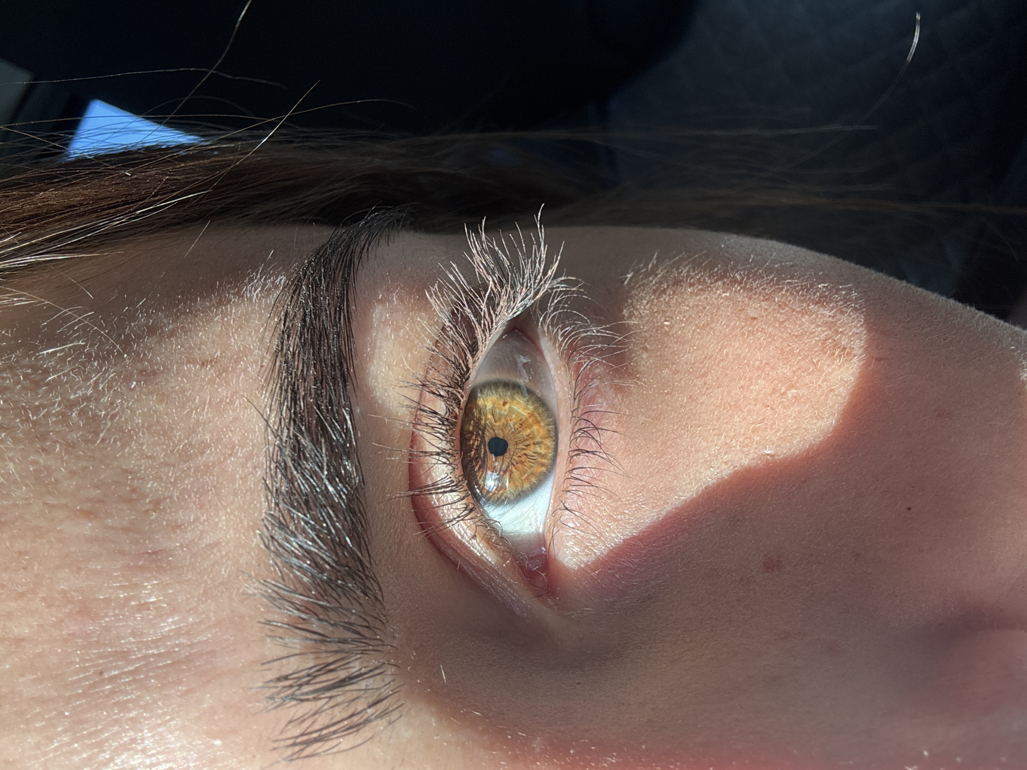 close-up of a person's eye, tilted to the side. The eye has a hazel iris with a dark pupil. The upper and lower eyelids are visible, with eyelashes. The skin surrounding the eye is fair, with some shadows cast across the face. Some hair is visible at the top of the frame. There is not enough information to give the specific location in the city of Cidade da Maia, Portugal.