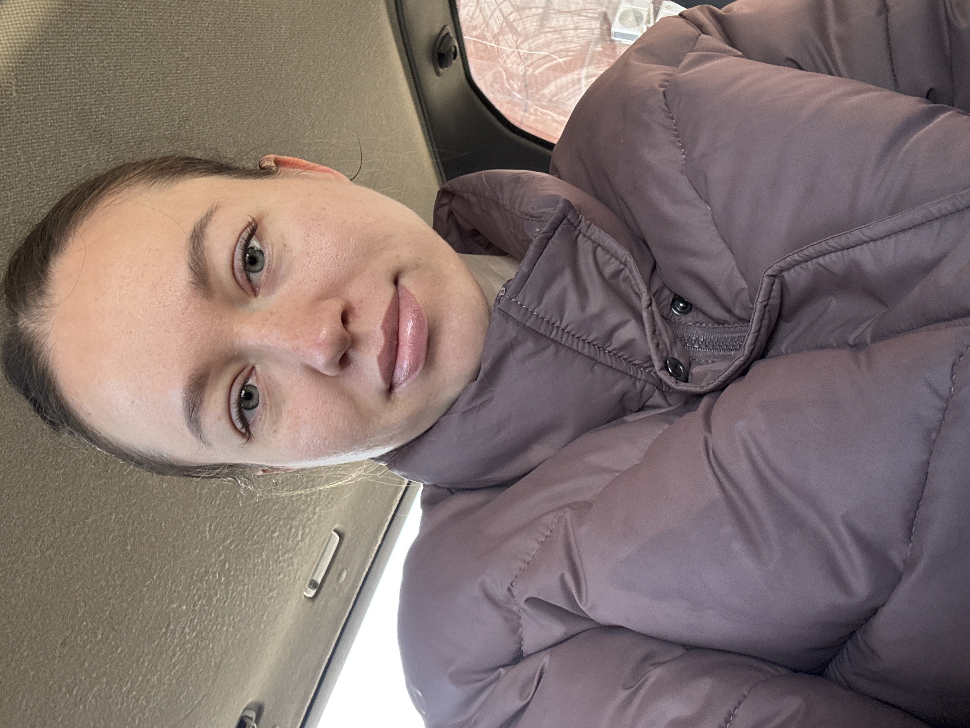 A young woman with fair skin, dark hair pulled back, and green eyes is seated in a vehicle. She is wearing a lavender puffer jacket. The interior of the vehicle, including the headliner, is visible. Outside the car window, it appears to be winter in Ферма, Russia. Bare trees and some buildings are visible through the window. The photograph is taken at an angle, with the camera tilted to the left.