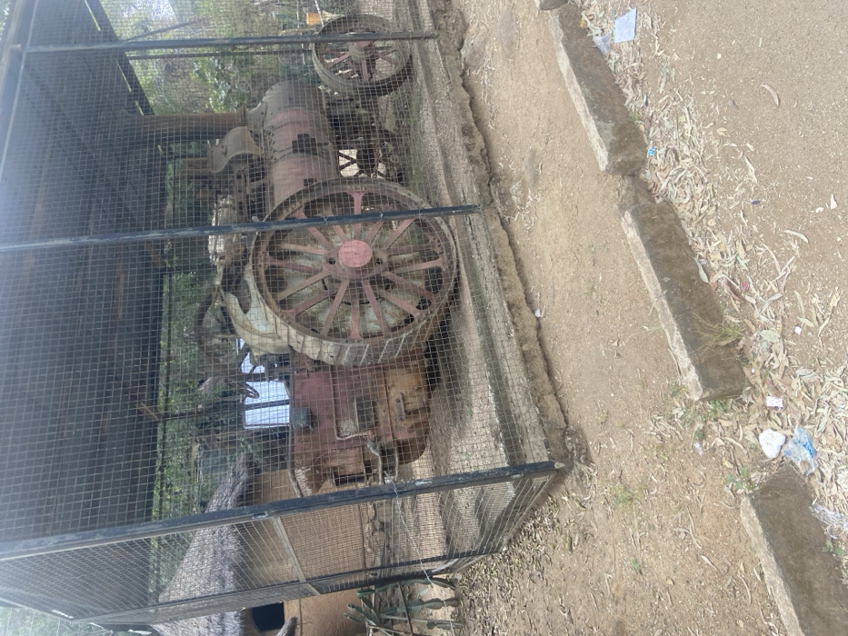 An old, rusty farm tractor sits inside a wire cage. The tractor has large, spoked wheels, and its body is weathered. The cage appears to be a protective barrier around the tractor, possibly for preservation or display. The surrounding area features a dirt ground and hints of vegetation.
