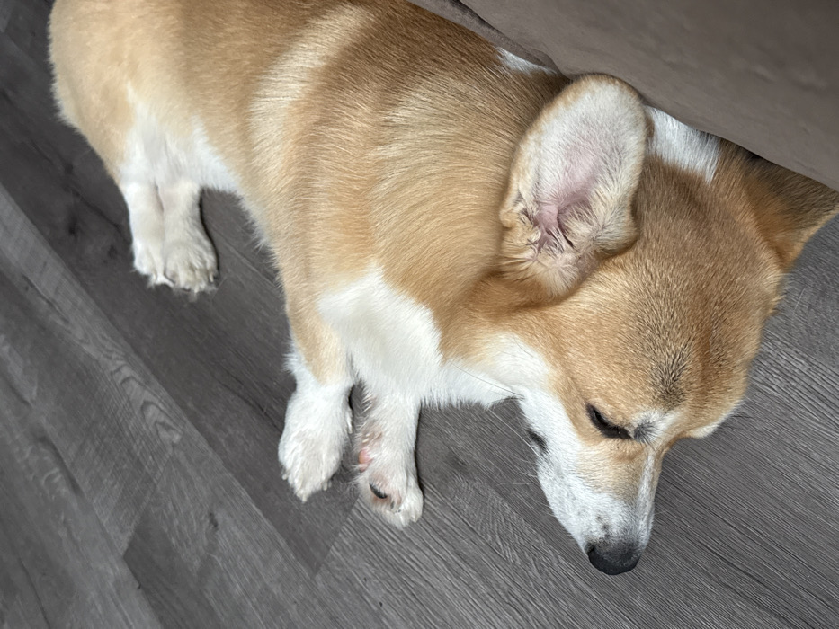 The image displays a Pembroke Welsh Corgi dog sleeping indoors. The dog, featuring a tan and white coat, is lying on its left side on a dark gray, wood-patterned floor. Its eyes are closed, signifying it is asleep. Visible details include its front paws, which show pink paw pads and dark claws. A portion of a brown, upholstered object, possibly a cushion or furniture, is visible along the right side of the dog's body. The scene is evenly lit, indicative of an interior setting. No visual information within the image identifies its specific geographical location, therefore its presence in Yekaterinburg, Russia, cannot be determined from this evidence.