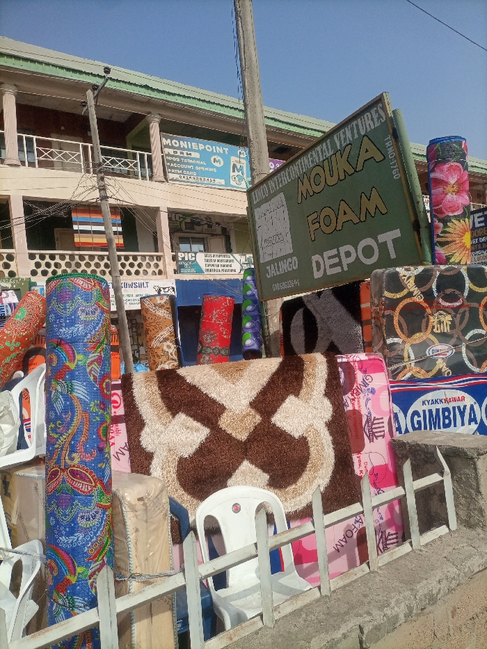 The image depicts a street-level commercial scene in Jalingo, Nigeria, characterized by a vibrant outdoor display of merchandise under a clear blue sky. No individuals are visible. In the immediate foreground, a low concrete barrier with white metal pickets runs horizontally. Behind this barrier, a diverse array of rolled mats, rugs, and mattresses are densely displayed. These include multiple rolls of fabric or mats featuring blue paisley, orange, brown floral, and red patterns. A prominent, thick, fluffy rug with a brown and beige geometric pattern is centrally placed on display. Several white plastic chairs are visible behind the barrier, intermingled with the merchandise. Stacked foam mattresses, some wrapped in plastic with pink or patterned covers (e.g., circular designs), are also part of the display. A large green sign, angled towards the viewer, reads "LINCO INTERCONTINENTAL VENTURES MOUKA FOAM DEPOT JALINGO," with "TR.NO:1760" and a phone number "07063632641" also visible. This sign is partially obstructed by a utility pole running vertically through the center of the frame. Another utility pole stands to the far right. In the midground, beyond the displayed goods, a two-story commercial building is visible. The upper floor features a "MONIEPOINT DRM" sign, indicating financial services such as "POS TERMINAL," "ACCOUNT OPENING," and "ATM CARD." The lower floor has a "PIC KONSULT" sign. Overhead electrical wires crisscross against the bright sky. The overall environment suggests a bustling urban retail setting, brightly lit by daylight.