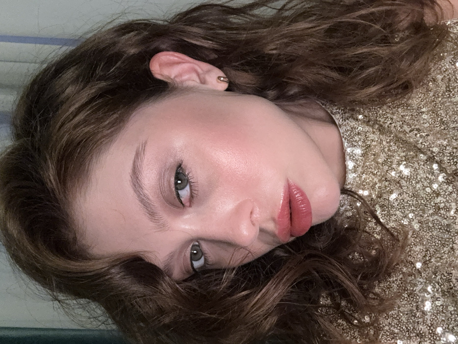 The image is a close-up portrait of a female individual, approximately young adult, with light skin, wavy brown hair, and green eyes. Her eyebrows are groomed, and she is wearing facial makeup, including pink blush on the cheeks, light eyeshadow, and red-toned lip gloss. She is dressed in a gold sequined garment, visible around the neck and upper chest area. A small, gold-colored stud earring is present in her right earlobe. The individual is looking directly at the camera with a neutral expression, lips slightly parted. The background is an indistinct, light-colored interior surface, possibly a wall, with a faint vertical line on the left side. The precise location within the city of Tbilisi, Georgia, cannot be determined from this image.