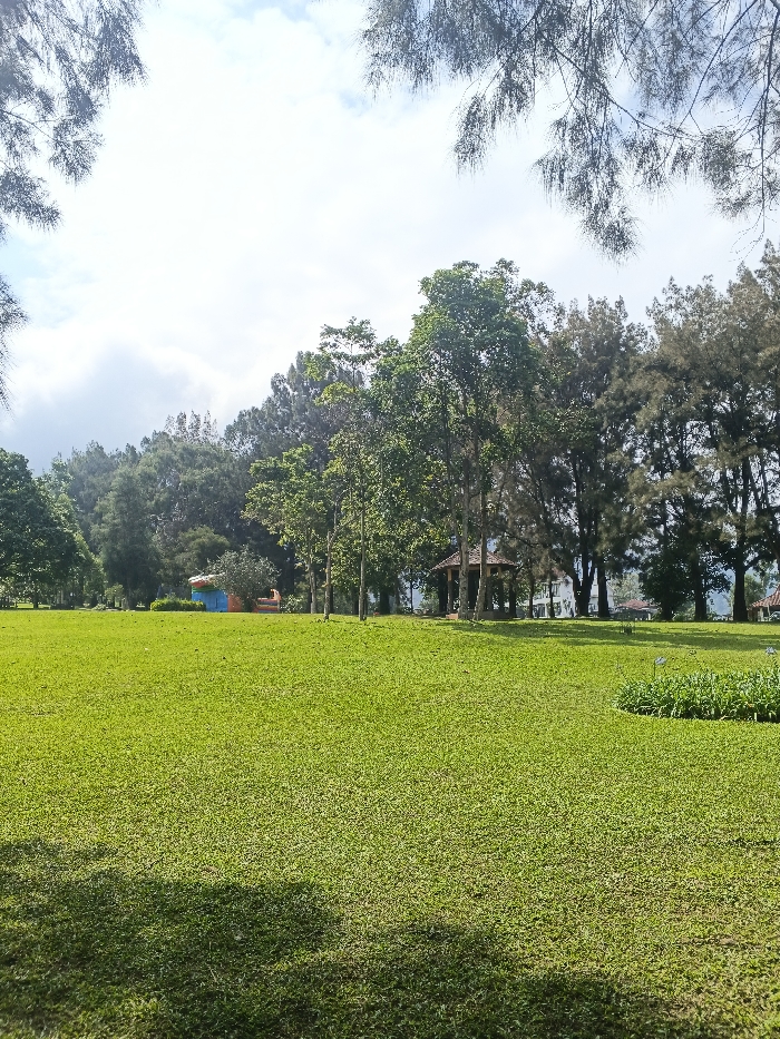 A verdant lawn occupies most of the frame, partially shadowed in the foreground. Various trees line the background, including lighter green deciduous trees and darker, pine-like evergreens. A small, colorful building and a gazebo are nestled amongst the trees. The sky is visible through breaks in the foliage, exhibiting a partly cloudy condition. Branches overhang from the top of the image.