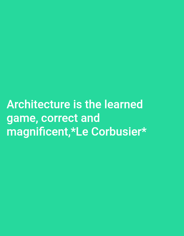 This image is a digital graphic displaying white text against a uniform, solid teal-colored background. The text is sans-serif, centrally positioned in the lower half of the frame, and reads: "Architecture is the learned game, correct and magnificent, *Le Corbusier*". The name "Le Corbusier" is italicized and enclosed within asterisks. No people, objects, actions, or interactions are depicted. The environment is entirely abstract, consisting solely of the colored background and superimposed text. The image does not contain any visual elements or contextual information that would indicate a specific physical location in the city of Ado-Ekiti, Nigeria, or any other geographical area.