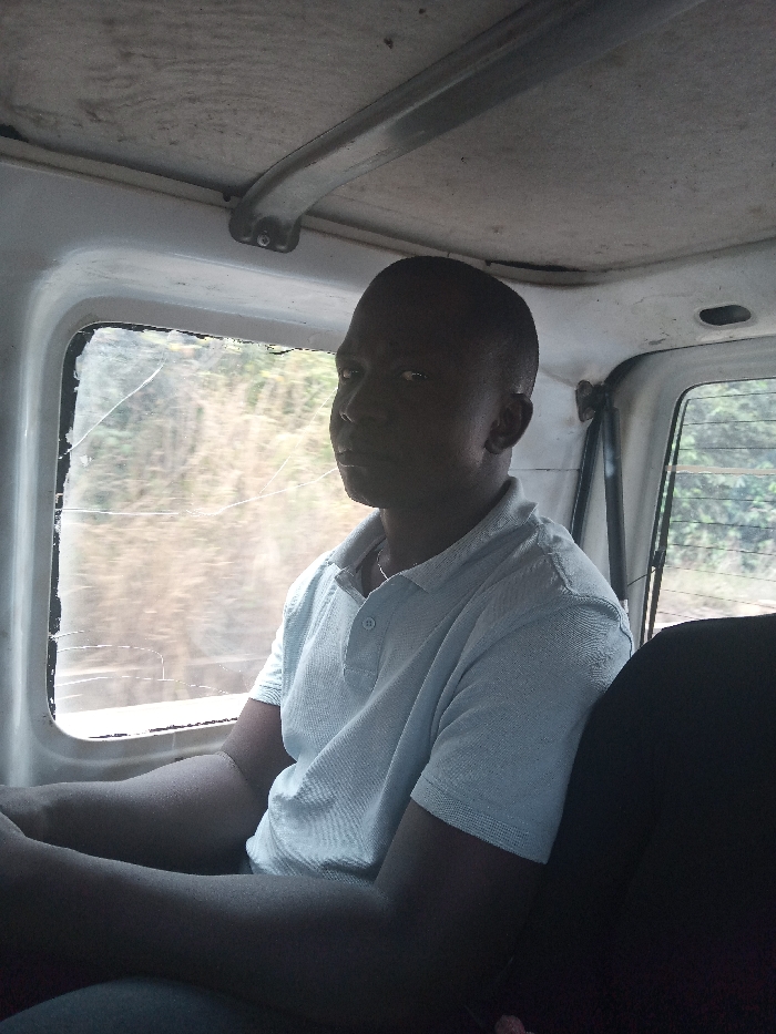 The image displays an adult male seated inside a vehicle, likely within or around Abor, Nigeria