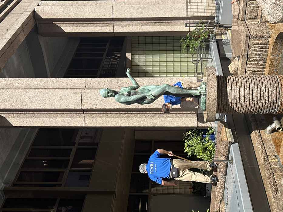 The image captures an outdoor urban scene in Shinjuku, Japan, under bright daylight. A central verdigris bronze statue of a nude female figure stands on a circular pedestal, which forms the upper tier of a multi-tiered fountain constructed from light-brown, textured stone blocks. Two adult males are present, performing maintenance. On the left, a male viewed from behind wears a blue t-shirt with "TORII STAFF" printed in white, khaki pants, and a black fanny pack, holding a long-handled tool. He stands on a dark, raised platform featuring a low chain barrier. To the right of the statue, a second male, wearing a blue short-sleeved shirt, khaki pants, and a white face mask, is bent over, actively cleaning or working on the fountain's base near the statue with a small implement. The background consists of a multi-story building with large, dark-paned windows and prominent vertical support pillars constructed from the same light-brown stone as the fountain. A section of translucent glass block windows is visible behind the second male. Green potted plants are strategically placed around the fountain area. The fountain basin in the immediate foreground appears dry, with a metal pipe visible near the bottom left. A metal railing is present to the right of the fountain structure.