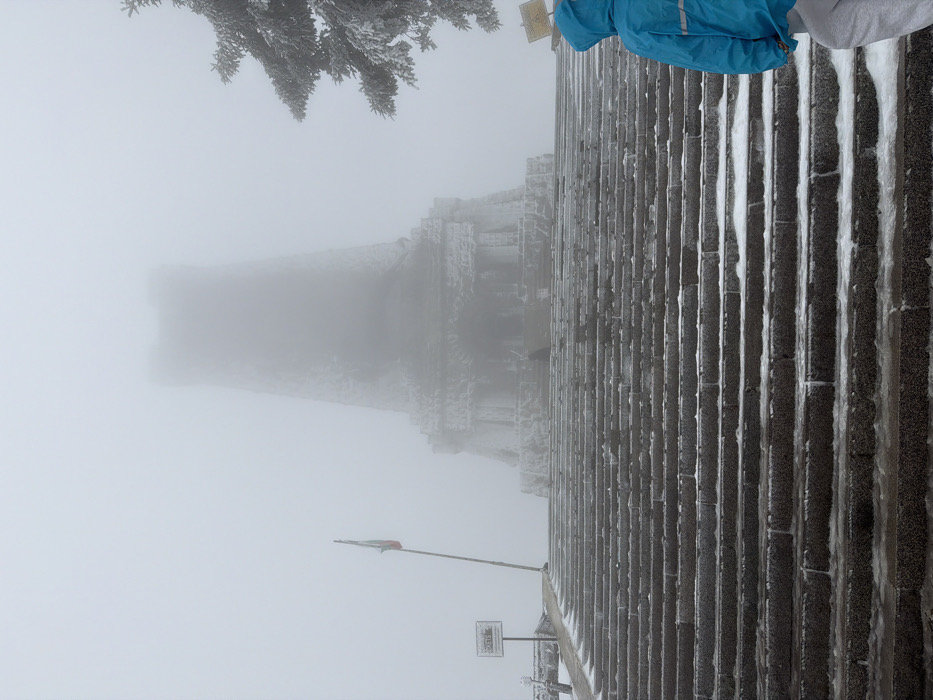 The image captures the Shipka Monument, also known as the Freedom Monument, located on Shipka Peak near the town of Shipka, Bulgaria, during a heavily foggy and snowy winter day. A wide, multi-tiered stone staircase, partially covered with snow and ice, extends from the foreground and mid-ground towards the base of the monument. In the immediate foreground, positioned to the right of the frame, the back of an individual is visible. This person wears a bright blue hooded winter jacket featuring reflective stripes on the sleeves and light gray athletic pants. They appear to be ascending the steps or observing the scene. Further up the staircase, near the monument's entrance, a dark-clad figure is faintly discernible. To the left of the monument, a flagpole bears the Bulgarian national flag, characterized by horizontal stripes of white, green, and red. Below the flag, a white rectangular sign, partially legible, displays the word "TICKETS." The Shipka Monument, a towering stone structure with battlements at its summit, is largely obscured by dense fog, particularly its upper sections. Its lower portions reveal detailed architectural elements, including arched entrances and carved stonework. The entire monument is heavily encrusted with a visible layer of rime ice and snow, reflecting the frigid conditions. On the far right of the frame, the branches of an evergreen tree, laden with snow and ice, are partially visible, contributing to the wintry ambiance. The overall lighting is diffused and soft, consistent with heavy fog and overcast skies.