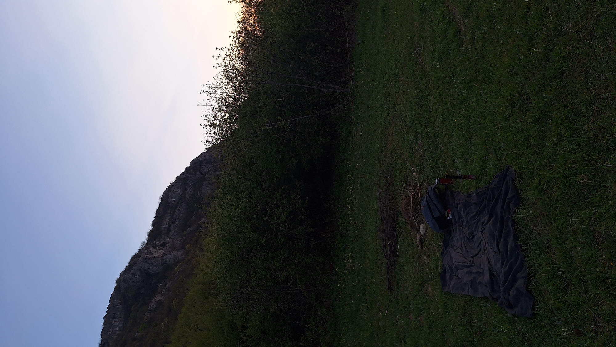 The image depicts a scene outdoors, likely at dusk or dawn given the sky's color gradient. In the foreground, there is grassy terrain. Scattered on the grass is a dark-colored cloth or sheet-like object, alongside a backpack. Adjacent to the backpack, there are some sticks and debris suggesting a possible former campfire site. In the background, a rocky cliff or hillside is visible, partially obscured by vegetation. The photo's location is likely near Vratsa, Bulgaria, due to the presence of distinctive rocky landscapes characteristic of the region. The image contains no discernible people or interactions.