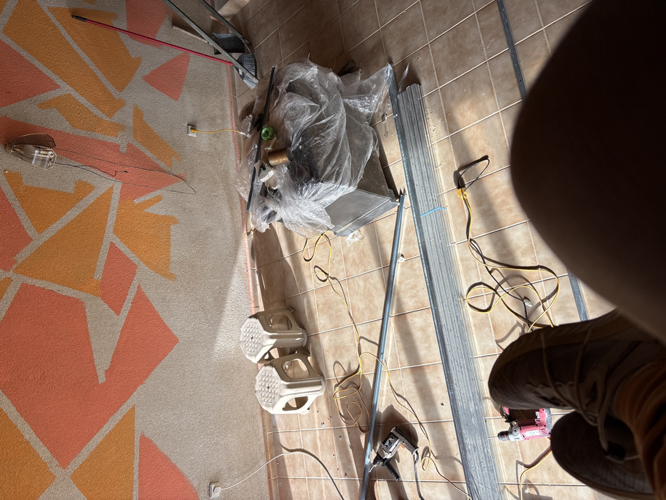The image depicts an indoor or semi-enclosed space in Stefan Karadja, Bulgaria, with signs of ongoing construction or renovation. The floor is covered in light brown square tiles. The wall on the left and back features a textured beige surface with an irregular geometric pattern painted in shades of orange and light peach. Strong natural light, likely sunlight, enters from the left, casting defined shadows across the floor and objects. In the lower foreground, the legs and feet of an individual wearing light brown lace-up boots are visible, suggesting a first-person perspective. **Objects present:** * Two identical light-colored, possibly plastic, hexagonal stools are positioned against the left wall. * Several yellow electrical cords are distributed across the tiled floor, some plugged into white and yellow wall outlets. * A silver power tool, possibly a grinder or cutter, is located on the floor to the left, with an attached cord. * A red and black drill or impact driver lies on the floor towards the lower-left. * Bundles of silver-colored metal profiles, consistent with construction framing materials, are stacked horizontally on the floor. A single longer metal profile runs across the mid-ground. * A large, rectangular object, possibly a piece of equipment or furniture, is covered with clear plastic sheeting in the middle-right. On top of this covered item are smaller objects, including a spool of brown twine or rope and a green cylindrical item. * Leaning against the right wall are a broom with a red handle and a dark-colored dustpan. * A bare-bulb light fixture with exposed wiring hangs from the upper-right section of the wall. * White and yellow electrical outlets are visible on the left and right walls, respectively, with cords plugged into them.