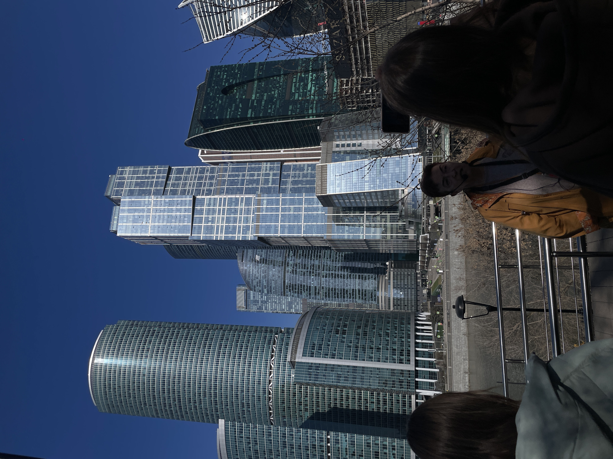 daytime view of the Moscow International Business Center (Moscow-City) in Moscow, Russia. Skyscrapers of modern design dominate the frame, with glass facades reflecting the clear blue sky. A group of people, partially visible in the foreground, appear to be tourists. One individual, likely a tour guide, is speaking. There is a railing in the foreground, and a river or body of water can be seen between the railing and the buildings. Bare trees are scattered in the vicinity.