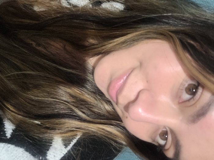 A woman's face dominates the image, tilted towards the right. She has fair skin, brown eyes, and dark, highlighted hair framing her face. Her lips are slightly parted in a gentle smile. She is wearing minimal makeup. A black and white patterned fabric is visible in the upper left corner, and a blue surface is present in the lower right corner, indicating she might be lying down. The lighting is soft and flattering.