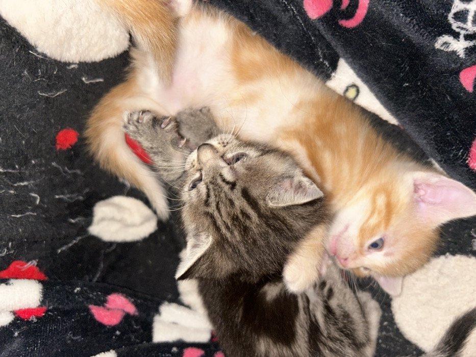 Two kittens are nestled together on a patterned blanket. One kitten is ginger and white, lying on its back with its belly exposed. The other kitten is tabby with gray and black stripes, curled against the ginger kitten. Their paws are intertwined. The blanket is black with white, red, and pink patterns.