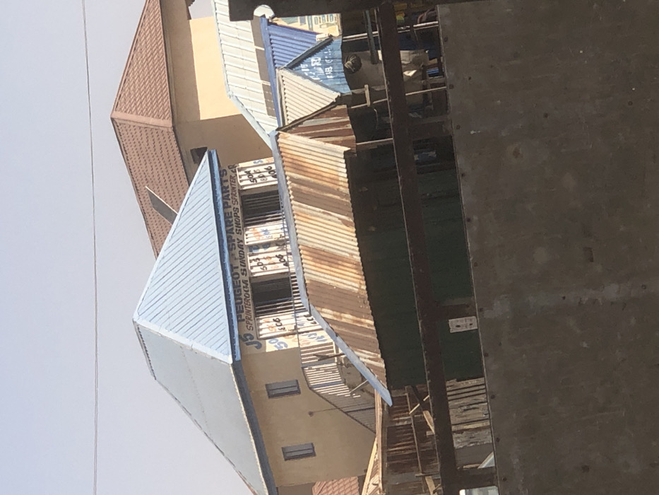 The image captures an urban street scene in Kufena, Nigeria, under daylight conditions with a hazy sky. In the foreground, a large, dark grey, riveted metallic surface occupies the lower portion of the frame, with a horizontal metal bar above it. The midground contains multiple single-story structures featuring corrugated metal roofs; one roof is predominantly rusty brown, while others are light blue. A dark green wall is visible behind the rusty-roofed structure. To the right, a person wearing a light-colored garment is partially visible standing near one of these smaller structures. In the background, a two-story building with a light tan facade and a light blue corrugated hip roof is prominently featured. On its upper level, a sign reads "J5 PEUGEOT SPARE PARTS" and "SPRINTEROGA SUNDAY SHOPS SPRINTER." Below this sign, multiple window openings are visible, with numbers such as "503," "504," and "506" painted on the facade. An external staircase with white metal railings descends along the left side of this building. Behind it, another building with a reddish-brown tiled roof is partially visible. A thin, dark line, consistent with a utility cable, stretches across the upper portion of the hazy sky.