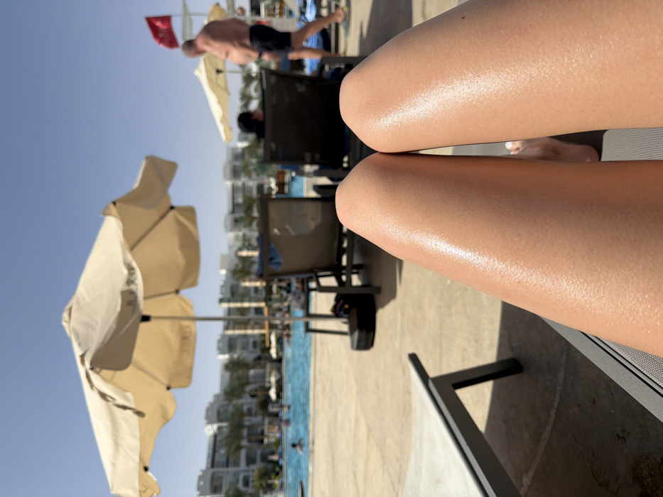 The image depicts a first-person view of a resort pool area in Sharm El Sheikh, Egypt, under a clear blue sky. In the immediate foreground, the photographer's legs are visible, extended and resting on a grey sun lounger, with tanned or moisturized skin. The midground features a large, blue swimming pool with multiple individuals swimming or wading. Surrounding the pool are beige paving stones, several sun loungers, and at least one large, light-colored parasol. A black bag or case is situated on the ground beneath a sun lounger. To the right, a shirtless, overweight male wearing dark swim shorts walks away from the pool area. Two other individuals are seated on sun loungers. The background consists of multi-story white hotel or resort buildings, partially obscured by palm trees. A red flag is visible on a pole in the far right background. The scene is brightly illuminated by direct sunlight, indicating clear weather.