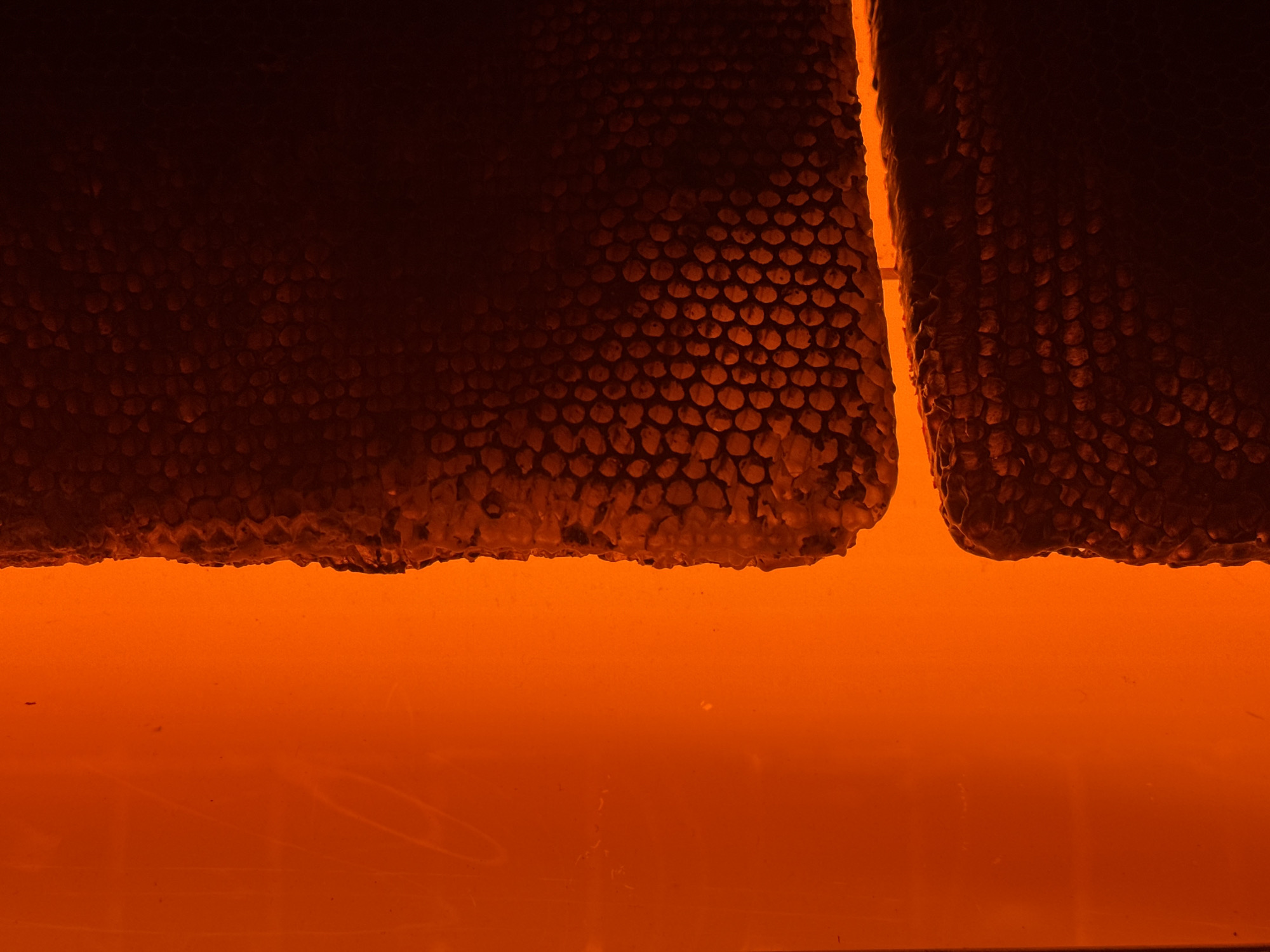 The image presents a close-up view of two dark, textured organic structures, resembling sections of a honeycomb, vertically positioned along the right side of the frame. A predominant, intense orange light source illuminates the entire left half of the image and functions as a backlight for the organic structures. This illumination renders the structures in shades ranging from deep red to near black, emphasizing their cellular, polygonal patterns. The upper structure is larger and distinct from the lower structure. A clear, horizontal gap separates these two masses, allowing a bright, narrow band of orange light to pass through. No human subjects or discernible activities are present. The scene is consistent with an indoor exhibit, potentially within a science or natural history museum in Moscow, Russia.