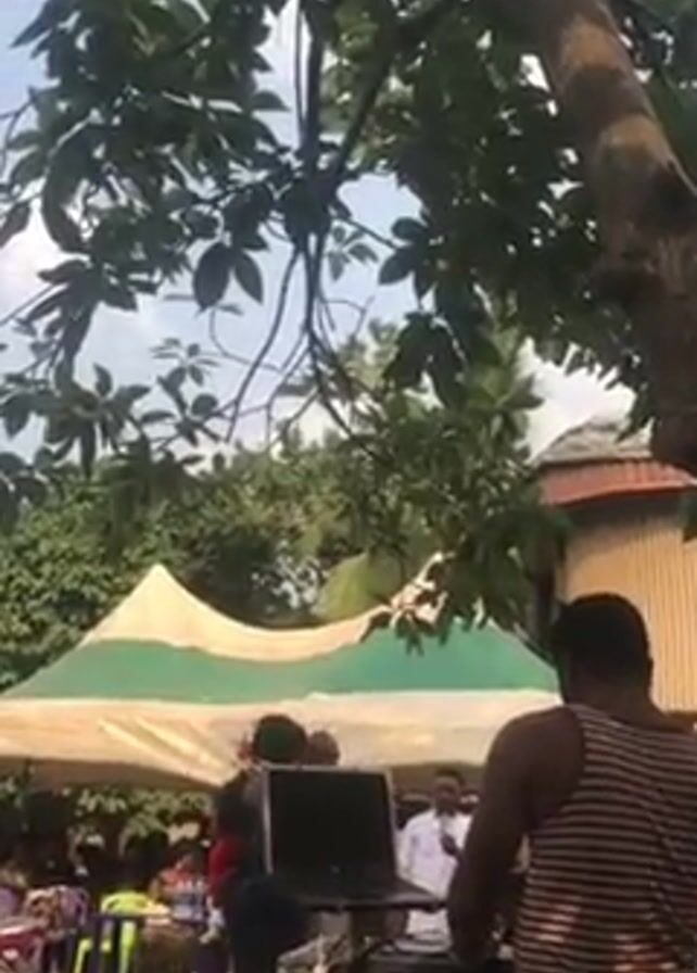 n outdoor event taking place under a tent with a green and white striped top. People are gathered around tables and chairs. In the foreground, a man is standing behind a DJ setup with a laptop, microphone, and sound equipment. He's wearing a striped tank top. Another man stands near him, also appearing to be involved in the event. Trees and foliage surround the area, providing shade. The sky is visible through the branches, suggesting a sunny day.