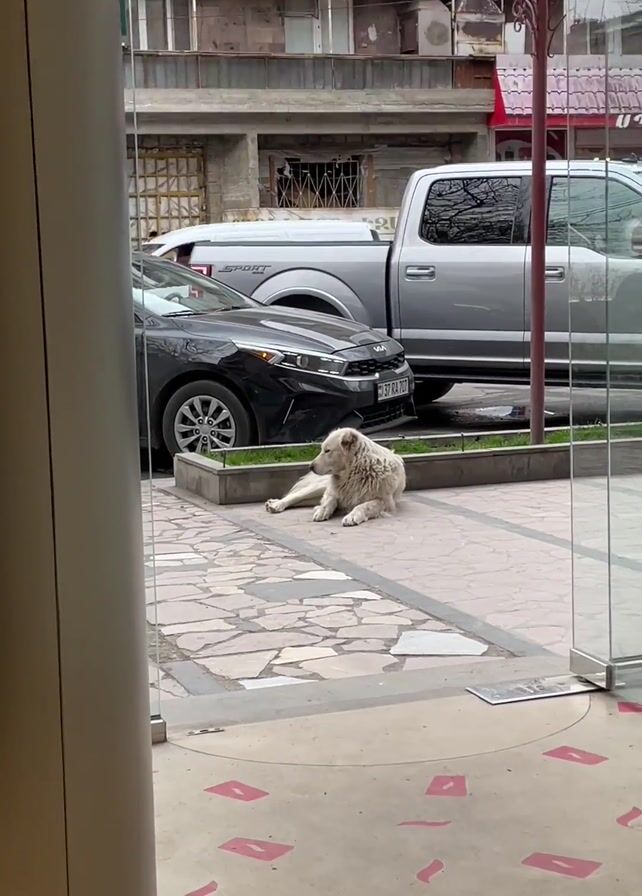The camera, positioned within a building behind a glass door, focuses on the outdoor scene. A large, white dog is lying down on a paved walkway between a black car and a silver pickup truck. A narrow strip of green grass separates the sidewalk from the street. The background features a multi-story building with balconies and a few people are seen on one of the balconies. The sidewalk is made of irregularly shaped stones, forming a mosaic pattern. The inside of the building has a circular design of red rectangles on the floor. The lighting appears to be bright and natural.