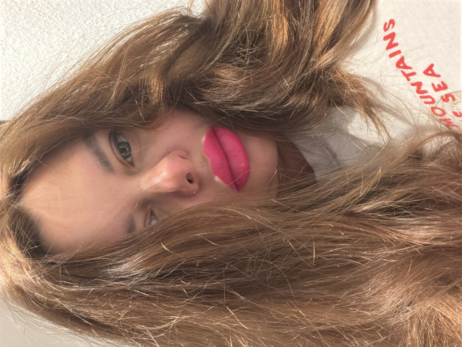 A young woman with blonde-brown hair and fair skin poses for a tilted selfie. Her striking pink lips are prominently displayed, while one green eye is clearly visible. The other eye is partially obscured. She rests on a white surface with text reading "Mountains Sea" in red letters. Her hair spreads out around her head, creating a soft frame. The lighting is natural and bright.