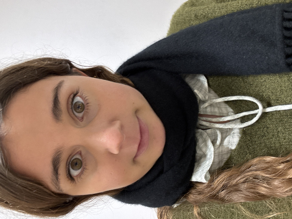 A head-and-shoulder shot features a young female subject looking directly into the camera. She has light brown hair, dark brown eyebrows, and wide, light brown eyes. Her mouth is closed with a slight upward curve at the corners. She wears an olive-green knitted sweater over a light-colored, possibly plaid or checked, collared shirt with a ruffled edge visible around the neckline. A loose white drawstring or tie hangs centrally from the shirt's collar. A black, finely woven scarf is wrapped around her neck, partially obscuring the lower portion of her chin and extending over her chest. The background is a plain, uniform white surface, indicative of an indoor setting. The specific location within Porto Salvo, Portugal, or any other city, cannot be determined from the image.