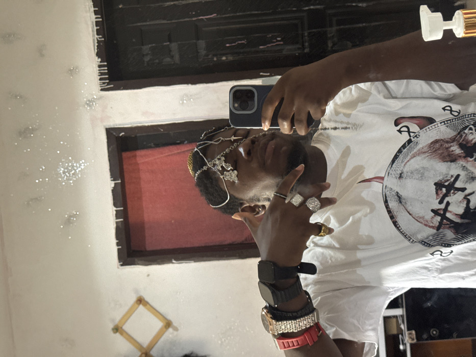 An individual is captured in a mirror selfie within what appears to be an indoor setting in the city of Asipa, Nigeria. The person, a young male with dark skin and short, dark hair, is positioned slightly to the right of the frame, holding a dark-colored smartphone (equipped with a triple camera array) in their right hand to take the photo. Their left hand is raised, fingers extended and splayed, displaying multiple rings: two large, square, presumably diamond-encrusted rings on the middle and ring fingers, and a gold-colored ring on the pinky finger. The individual wears a white short-sleeved t-shirt featuring a graphic print depicting a skull-like image with 'XX' markings. On their left wrist, multiple timepieces and bracelets are visible: a red silicone band watch, a gold-colored metal link watch, and a black silicone smart watch. A gold-colored, crown-like object rests on top of their head, beneath a silver-colored chain headpiece draped across the forehead, adorned with various charms including crosses and teddy bears. A silver-colored chain is also visible around the neck. The background, reflected in the mirror, reveals a light-colored wall with scattered glitter-like specks and what appear to be paint drips or stains near a dark horizontal line. To the left, a dark-framed opening with a red curtain is visible, along with a wooden, diamond-shaped decorative object mounted on the wall. To the right, another dark-framed, dark-colored door or opening is present. A white pump bottle with a gold-colored base is situated in the lower right corner of the reflection.