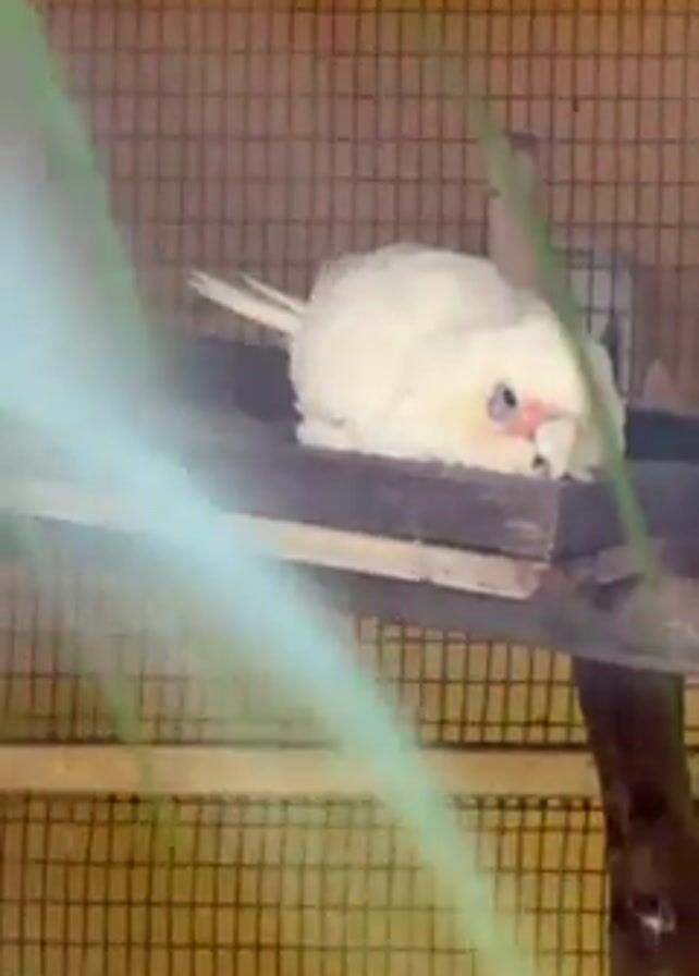 A white cockatoo with a pale pink face rests on a wooden perch in a cage