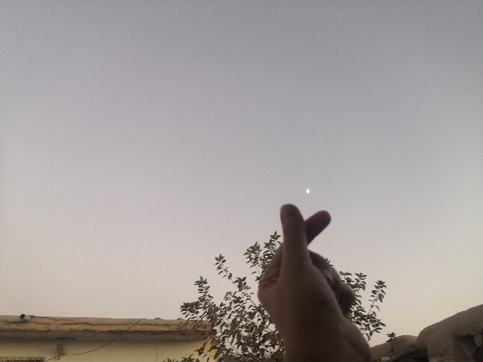 A human hand, positioned in the lower-middle foreground, performs a Korean finger heart gesture with the thumb crossed over the index finger. The scene is set against a sky transitioning from a pale greyish-beige near the horizon to a light grey-blue overhead, indicative of dusk or dawn. A singular, bright white celestial object, likely the moon or a prominent star, is visible in the upper-middle sky. Behind the hand, a tree with dense dark green foliage occupies the mid-ground. In the lower-left background, a light-colored building with a flat, weathered roofline is partially visible. An additional low, earthen-toned structure or mound is present in the lower-right background. The scene is located in Akhundzadakhail, Pakistan.