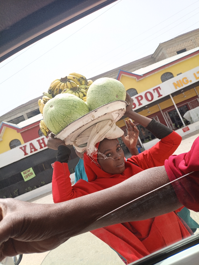 The image, captured from inside a vehicle in Hotoro, Nigeria, depicts a dark-skinned woman balancing a worn white tray on her head