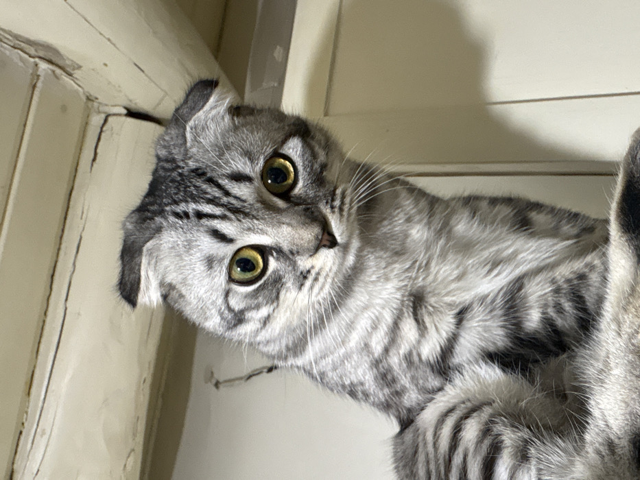 - "An indoor scene features a domestic Scottish Fold cat, distinguished by its folded ears and silver tabby coat with dark grey stripes" by FM-xlahD2, licensed under CC BY 4.0